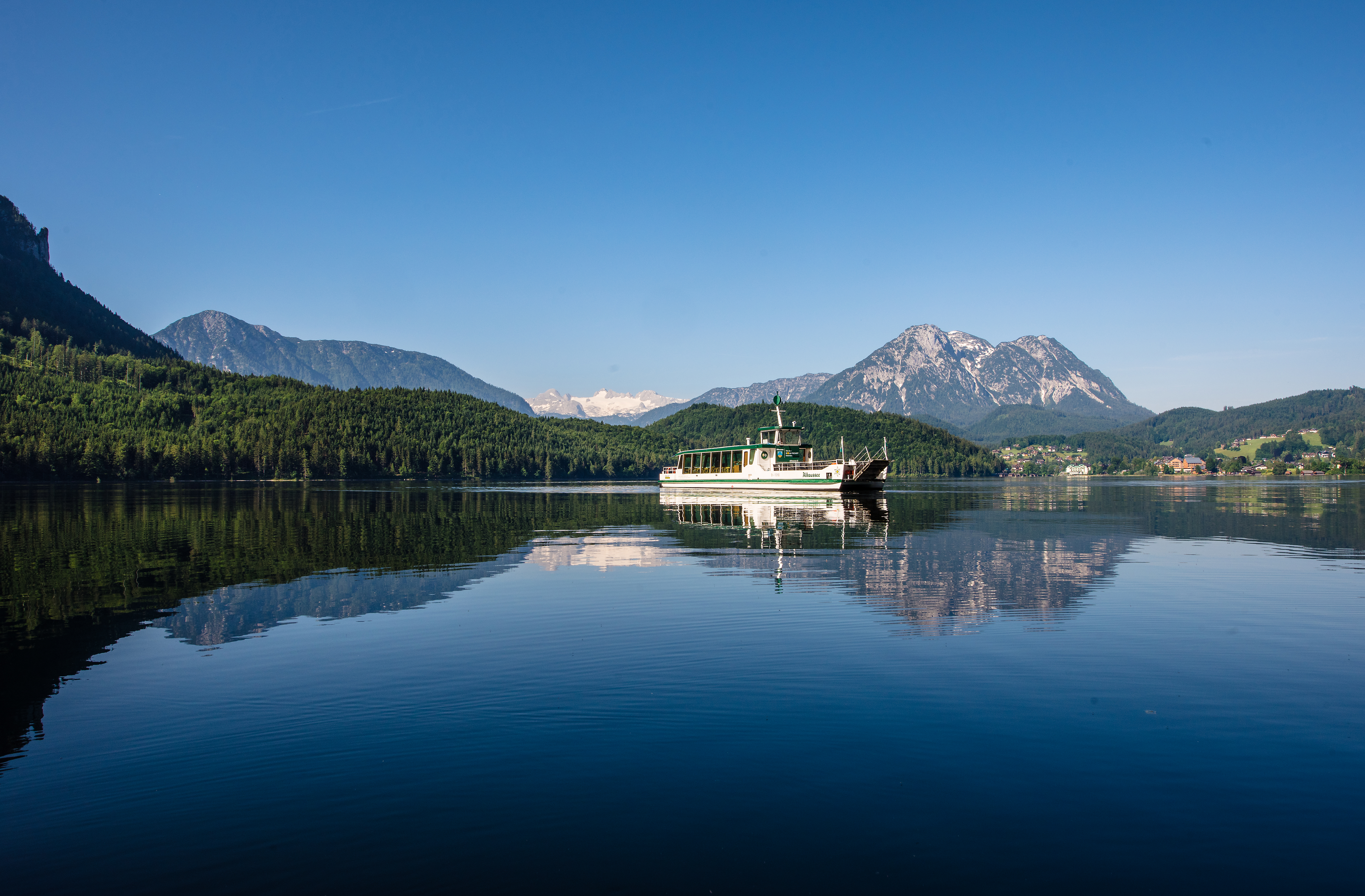 Starten Sie entspannt mir einer einstündigen Rundfahrt auf dem Solarschiff „Altaussee“mit herrlichem Blick auf den Ort Altaussee, die Trisselwand, den Loser und das mächtige Dachsteinmassiv.
